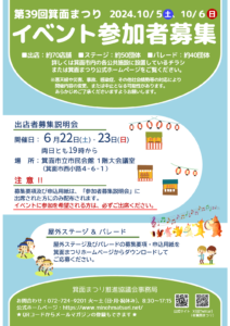 【重要】「第39回箕面まつり参加者募集」について 2024 5/25 2024.05.25 <屋外ステージ & パレード 参加者募集> 第39回箕面まつり「屋外ステージ」と「パレード」の参加申込書を掲載しました! ▼屋外ステージへの出演希望者は こちら ▼パレードへの参加希望者は こちら イベントの申込方法や記入例、応募締め切り日など、詳細は各ページでご確認ください。 たくさんのご応募、お待ちしております!! ◆5月17日公開、「出店者募集説明会」の詳細は こちら 新着情報